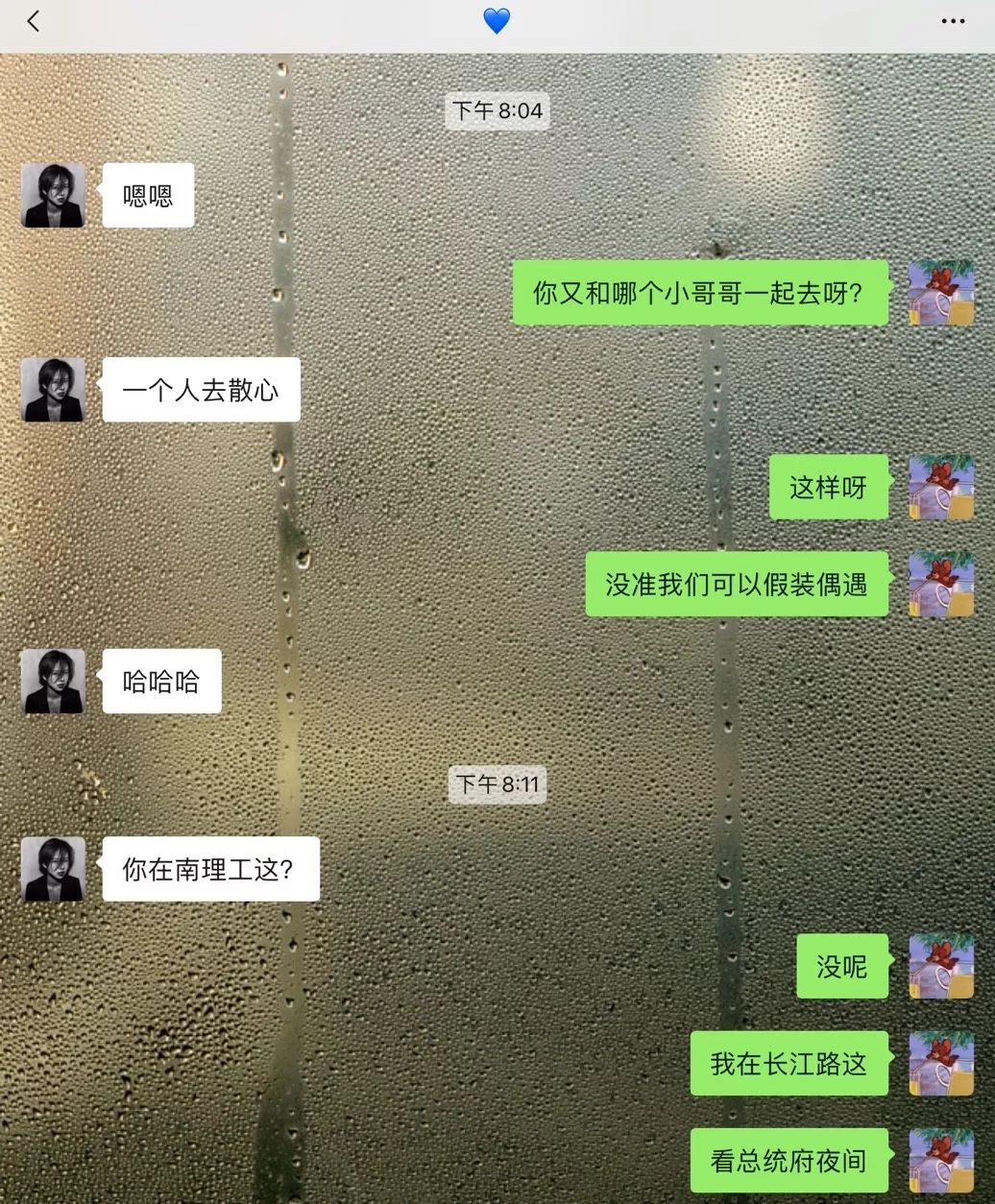 后面有一天我发了条在南京玩的朋友圈,然后收到了她的私信,她问我也在南京吗?我当时没怎么在意,就随意问了下她也在南京吗,然后就有了后面这一出。